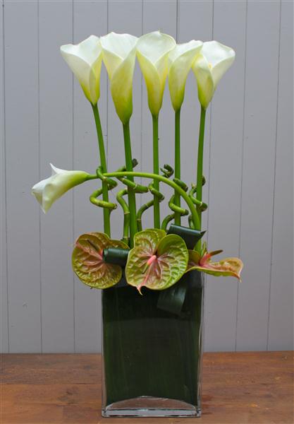 Simplicity itself, clean lines and two colours. This arrangement was inspired by a trip to New York and the contemporary floristry in the Big Apple. Arum lilies, anthuriums, bamboo and aspidistra leaves are used to create this statement piece.
