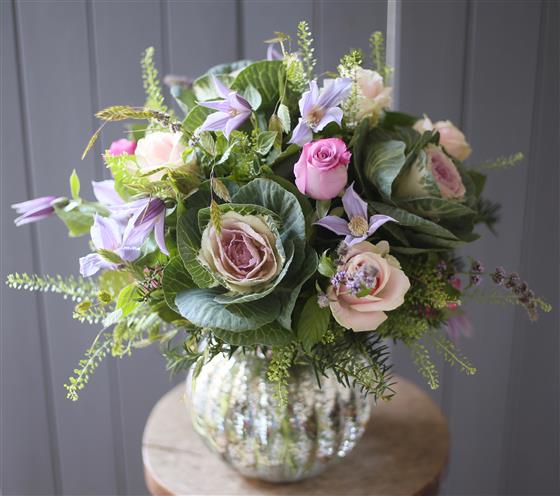 Cabbages and Roses, featuring Sweet Avalanche roses and White Crane Brassica in a beautiful vase.