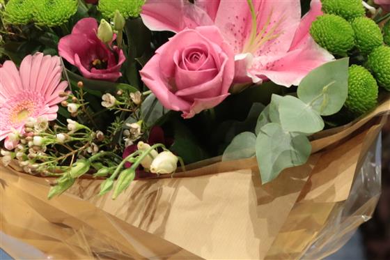 A scented hand tied bouquet including roses, lilies, lisianthus highlighted with lime green chrysanthemums.