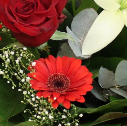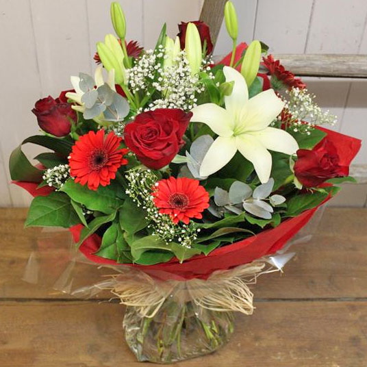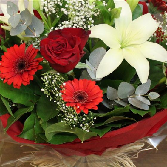 Red roses, white asiatic liles, red germini and babies breath hand tied and delivered free standing in water.