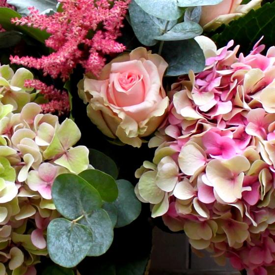 A beautiful bouquet filled with mottled hydrangea, grey foliages Astilbe and blush Roses.