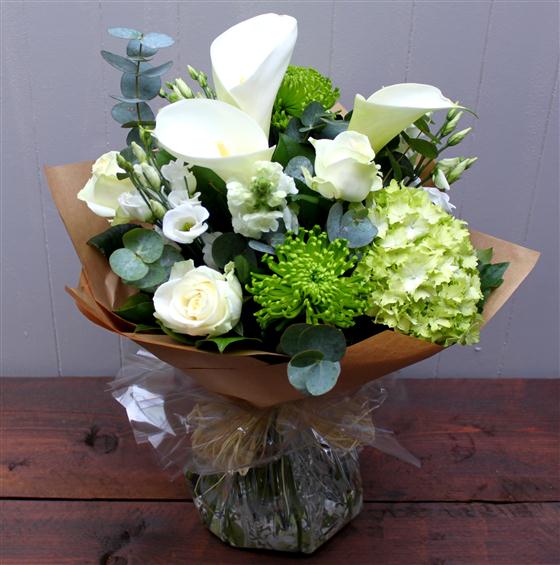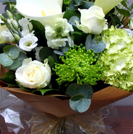 White Arum lilies, white roses, Hydrangeas, Shamrock and Lisianthus.